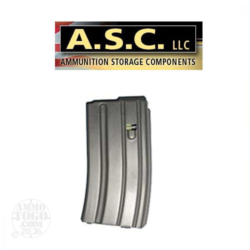 This is a ASC AR-15 223 / 5.56 20rd. Aluminum Curved Body Magazine Gray Color. Gray anti-tilt follower.