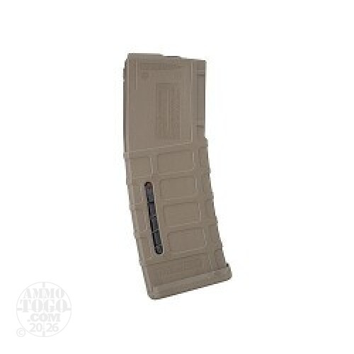 This is the Magpul PMAG 30 Maglevel Flat Dark Earth 30 Rd. AR15/M16 Magazine with window. The PMAG 30 5.56x45 NATO AR15/M16 compatible magazine is made from a lightweight advanced impact resistant polymer. The PMAG 30 has a corrosion resistant stainless steel spring, and an anti-tilt, self lubricating follower for improved reliability. This new version has new body ribbing design which improves compatibility with aftermarket magazine couplers, a new follower for smoother loading with stripper clips, and an Impact/Dust cover that snaps on the floorplate to prevent loss. This magazine is made in the U.S.A.