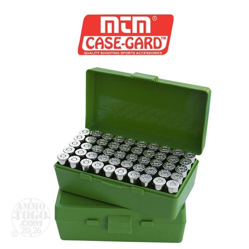 This is MTM Case-Gard P50 Series 50rd. Pistol Ammo Box for .44 Mag - .45LC Green Color. Want to hold up to 50 rounds of ammo conveniently? These flip top boxes are available in five sizes to accommodate any type of handgun ammo. They are stackable for storage, feature an easy-to-grip textured surface and come with a load label. All MTM Case-Gard's are MADE IN USA in Dayton Ohio.