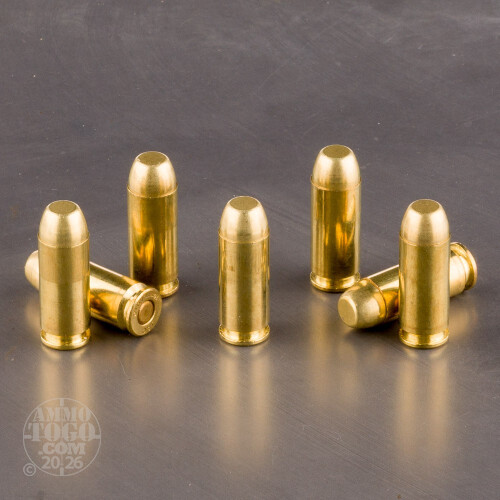 These new 10mm Auto rounds from Team Never Quit are made in the United States using quality components and stringent quality control standards. Parts used include factory-new brass casings with the proper wall thickness to ensure safe function over the course of many reloads. Each case is loaded with a non-corrosive Boxer primer at its base and clean-burning propellant grains. The 180-grain full metal jacket (FMJ) bullet produces a muzzle velocity of approximately 1,100 feet per second.The FMJ's thick copper jacket resists shedding and prevents excess lead from fouling bores and actions. Team Never Quit uses a bullet design with a rounded ogive and flat nose which is compatible with modern 10mm magazines and provides easy feeding. The flat tip helps to create clean holes in paper and cardboard targets for simple group measurement.