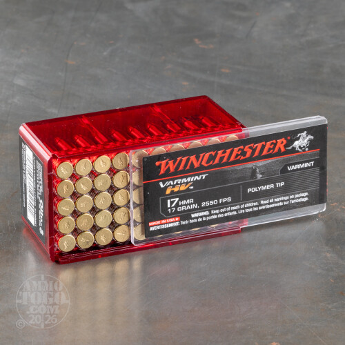 This bulk pack of .17 HMR rounds from Winchester will give you accurate zeroing and maxed out bag limits for many small game seasons to come. These high velocity cartridges are built using brass rimfire casings which are primed with a non-corrosive ignition mixture and filled with a clean-burning powder. Each round is topped with a V-MAX projectile from Hornady which possesses a deep hollow cavity that is mostly taken up by a polymer tip. This design gives the 17 grain bullet unfailing drag resistance, unmatched precision, and explosive terminal effect on target.