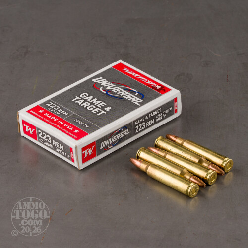 Winchester Universal Game & Target 223 Rem ammo is just as it sounds: great for eliminating small game and shooting targets! Yes sir, coyotes and rodents will not like that you have this ammo, but they will be unable to do anything about it because you have this ammo!The 62 grain open tip is an upgrade over the run-of-the-mill 55 grain FMJ most AR-15 marksmen choose to practice their craft. Its extra bulk grants it extra momentum – precisely what you want if you’re trying to shoot accurately in a crosswind. Its narrow nose cavity won’t cause the open tip to widen as it plunges through soft tissue, but its evenly distributed lead core and thin, uniformly thick jacket supply the added stability great accuracy revolves around.