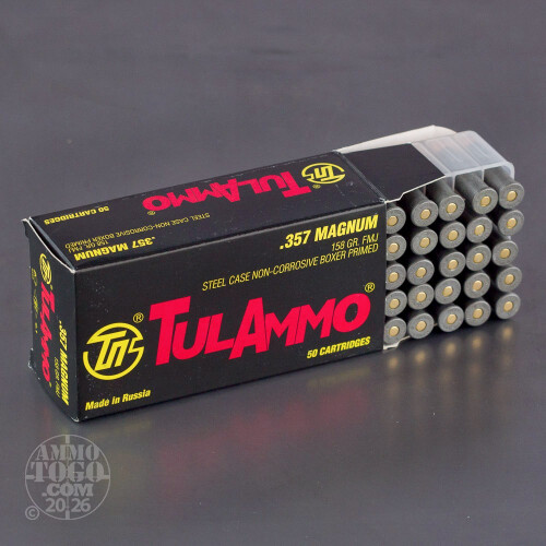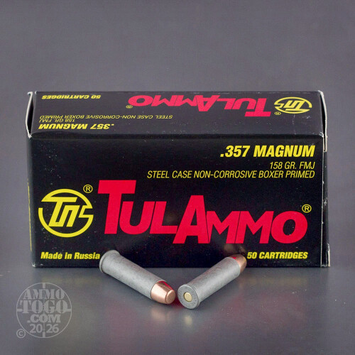 This is .357 Magnum Tula 158gr Full Metal Jacket Ammo. This ammo is manufactured in Russia. It has a polymer steel case and a bi-metal jacket. This ammo is berdan primed and non-corrosive. It comes packed in 50rd. boxes.