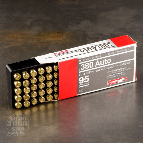 This is Aguila .380 Auto 95gr. FMJ ammo. This ammo is brass cased, boxer primed and 100% non-corrosive. Aguila is the exclusive manufacturer of ammo for the Mexican military and police forces. This ammo is manufactured to military and SAAMI specs. It is packed in 50rd. boxes, 1000rds. per case.