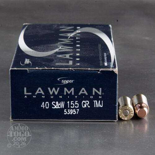 Perfect for the high-volume shooter, this package contains 1000 rounds of Speer Lawman .40 Smith & Wesson ammunition. Each round is loaded with a 155 grain total metal jacket (TMJ) projectile. The plated jacket fully encapsulates the soft lead core to limit expansion and provide deep target penetration.
