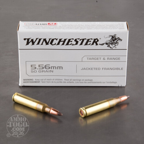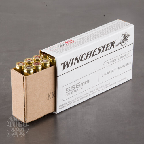 Frangible ammo is your go-to load for tactical training or steel target shooting. These 5.56 NATO cartridges for AR-15s and other rifles fire a semi-jacketed frangible projectile that breaks into harmless powder upon contact with hard surfaces. This keeps ricochets to a minimum and makes close-quarters practice much safer! This ammo is made by Winchester in the USA and uses non-corrosive Boxer primers and brass cases. Each case contains 1,000 cartridges.-