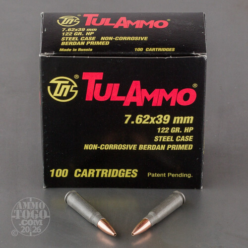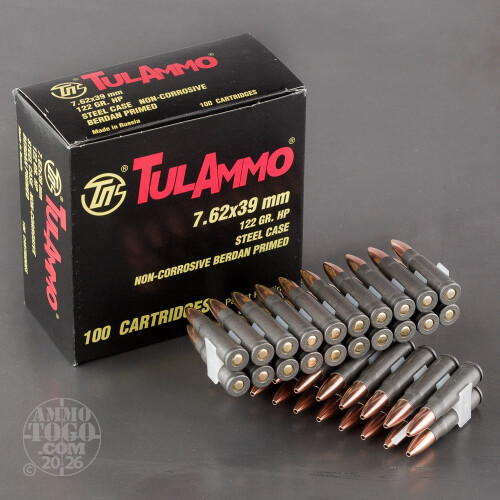 This 1,000 round case of 7.62x39mm ammunition from Tula will keep your AK or SKS well fed for quite some time--and at a reasonable cost. These cartridges fire a 122 grain hollow point bullet suitable for both inexpensive hunting and range use. Like other Tula products, this ammo is loaded in Russia using non-corrosive Berdan primers and non-reloadable steel cases.-