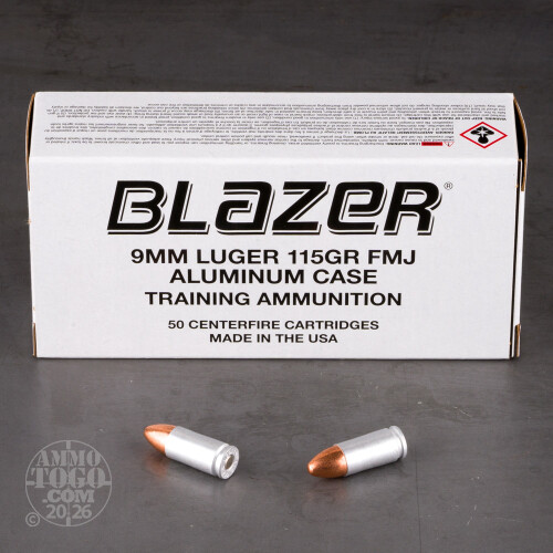 Why do these 9mm training loads have aluminum cases? Because aluminum is a whole heck of a lot cheaper to pull out of the earth’s crust than the copper which is needed to make brass! Blazer’s special heat-treatment process yields very strong aluminum cases, and the metal’s lower density also makes this case of ammo just a little bit lighter than usual. A great way to save money without compromising your experience at the range!This round’s bullet is a little more conventional. At 115 grains it’s all set to rip out of a pistol barrel at a velocity of 1,145 fps – that delivers a flat trajectory, as well as one which is extremely similar to that of any 115 grain self-defense load. Blazer’s FMJ is nonmagnetic, and supports reliable functionality in any semi-auto firearm.