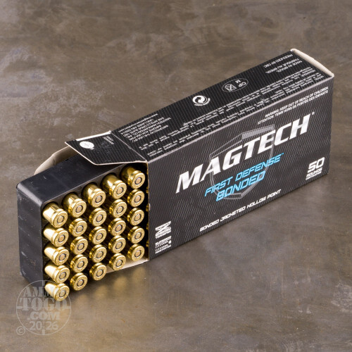 The First Defense ammo line from Magtech is a superb choice for duty and personal protection in the woods, at home, or own the streets. These 9mm Luger rounds feature bonded jacketed hollow-point (JHP) projectiles with a standard NATO weight of 124 grains which offers manageable recoil for efficient follow-up shots. Bonded JHP bullets have their jackets permanently attached to their lead cores; this produces unyielding weight retention and unfailing expansion in a target after passing through barriers like plywood, drywall, denim, leather, and auto-glass. The result is a bullet that is more likely to function correctly and transfer maximum energy into a target in order to end a fight with authority.