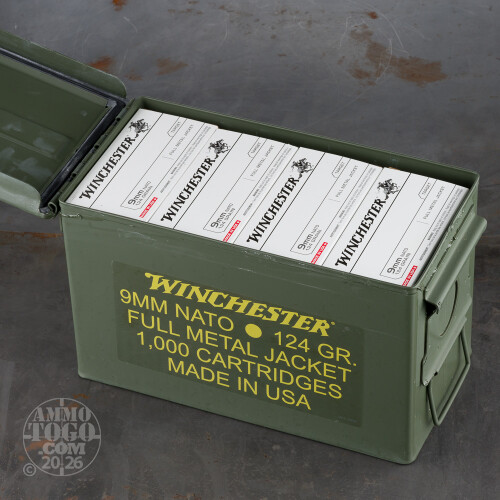 1000rds – 9mm NATO Winchester USA 124gr. FMJ Ammo in Ammo Can