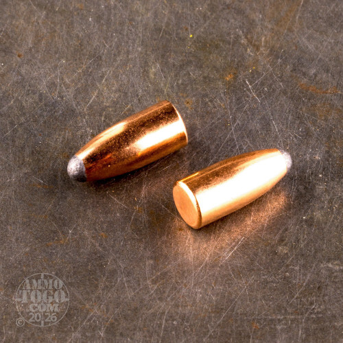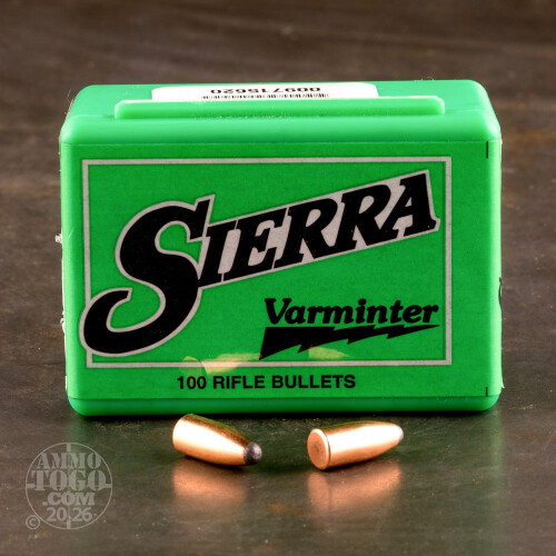 These lightweight .22 caliber bullets from Sierra's "Varminter" line are perfect for taking down coyotes, foxes, and groundhogs with clean precision and excellent terminal performance. Each of these component bullets features a gilding metal jacket which covers its flat base but leaves the very tip of its rounded nose exposed. The bare lead tip feeds smoothly, resists drag in-flight, and is bordered by a thinner section of copper jacket for reliable expansion upon impact. This mushrooming design is achieves quick, humane kills with calibers like .22 Hornet and .218 Bee.