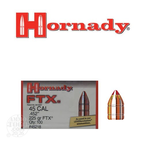 These are 45 Cal .452" Dia Hornady 225gr. FTX Polymer Tip Bullets. The Flex Tip design makes the FTX safe in all tubular magazines and delivers controlled expansion across a broad range of velocities. The FTX also delivers the flattest trajectories EVER from lever guns. Handgun performance also benefits from the FTX bullets. These bullets are packaged 100pcs to a box.