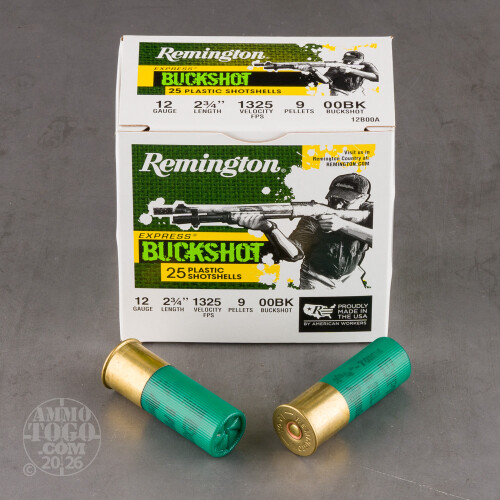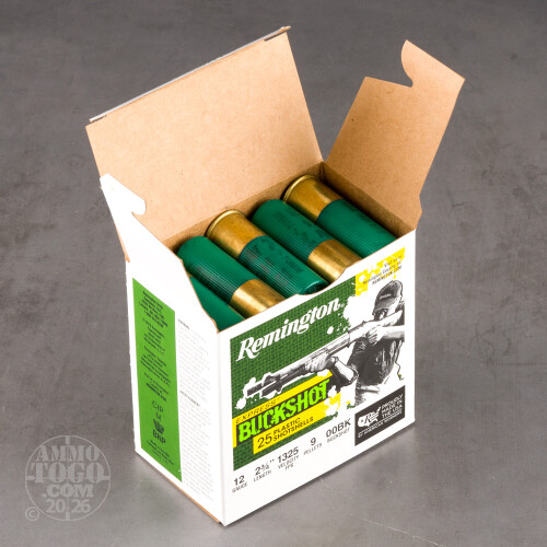 Perfect for the high-volume shooter, this package contains 100 rounds of Remington 12 gauge ammunition. Each 2 ¾ inch shotgun shell is loaded with 9 pellets of 00 lead buckshot. Each round produces a consistent muzzle velocity of 1325 feet per second.