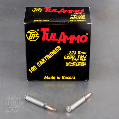 High volume AR-15 shooters will save a bundle on their ammo costs with these .223 Remington cartridges from Tula. These steel-cased rounds have similar external ballistics to M855 ball and fire a 62 grain bimetal jacketed bullet. They're ideal for target practice and use non-corrosive Berdan or Boxer primers and non-reloadable steel cases with friction-reducing polymer coatings. Each box contains 100 rounds.-