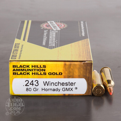 This is .243 Win. Black Hills Gold 80gr. Hornady GMX Polymer Tip Ammo. This ammo has the Hornady GMX Tip. Black Hills Ammunition is highly respected all over the country. Black Hills supplies all five US military branches with ammunition. There are many Law Enforcement Agencies using Black Hills nationwide. They only use the best components available. This factory new ammo is very accurate, dependable, 100% non-corrosive, boxer primed and reloadable. Black Hills. This ammo is brass cased, non-corrosive, comes packed in 20rd boxes.