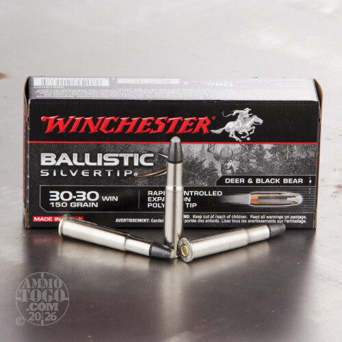 This is .30-30 Winchester Super-X 150gr. Silver Tip Ammo. Super-X Silvertip features a special aluminum alloy nose cap bullet design that promotes high accuracy, protects the soft lead core and regulates bullet expansion for maximum energy deposit and deep, game-stopping penetration. This ammunition is new production, non-corrosive, in boxer primed, reloadable brass cases. This ammo comes packed in 20rd boxes.