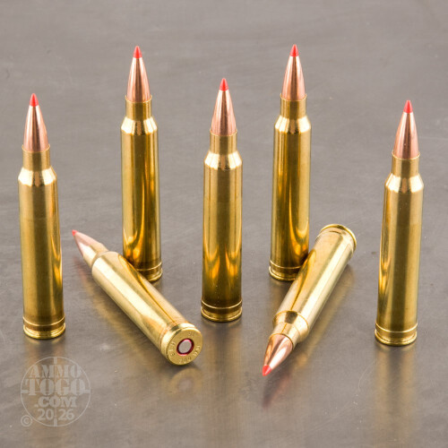 Leaving the muzzle at a velocity of 3000 feet per second, each round generates 3557 foot pounds of muzzle energy. This ammunition is 100 percent non-corrosive, boxer primed, and features reloadable brass cases.