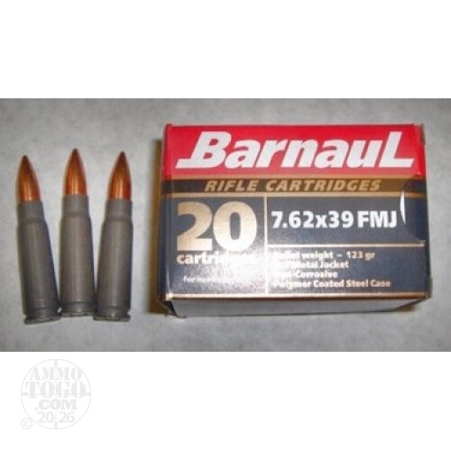 This is 7.62x39 Barnaul Polymer Cased 123gr. FMJ Ammo. This ammo is manufactured by JSC Barnaul Machine-Tool Plant in Russia. Barnaul is considered to be the premier ammunition factory in Russia, and it supplies most of the ammo to the Russian Military. This ammo has a Polymered steel case and it is much CLEANER than any other Russian brand, such as Wolf. I sell both brands and have shot both brands, and I prefer the Barnaul ammo over the wolf ammo, hands down. This ammo is 100% non-corrosive and the primer is sealed for moisture protection. It comes packed in 20rd boxes, 500rds. per case.