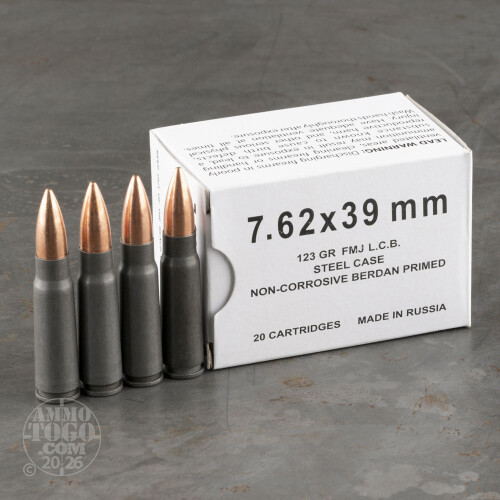 This is 7.62x39 Klimovsk 123gr. Lead Core Full Metal Jacket Ammo. The Klimovsk Specialized Ammunition Plant has produced both top of the line standard ammo and specialized varieties of ammunition for the Russian government for since 1936, but is probably most known for their large line of 7.62x39 cartridges for both military and civil use. This particular 7.62x39 is from their hunting line and is tipped with jacketed lead 123gr. FMJ projectile. This ammo is steel cased, lacquer-coated, berdan primed, magnetic, and non-corrosive. This ammo comes packaged 20rds to a box. Muzzle Velocity: Unknown.