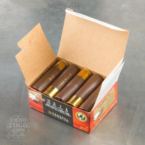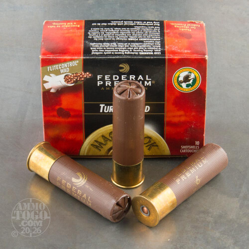 Looking for 10 Gauge ammo for your turkey gun? Check out this Federal Premium Mag-Shok High Velocity 3 1/2" 2oz. #6 Turkey Load. This rounds uses copper-plated extra hard lead shot and improved granulated buffer cushions for solid and reliable patterns.The Patented Flitecontrol wad design featured in this shot shell round provides controlled release of shot for the tight patterns high level of pellets on target.