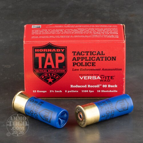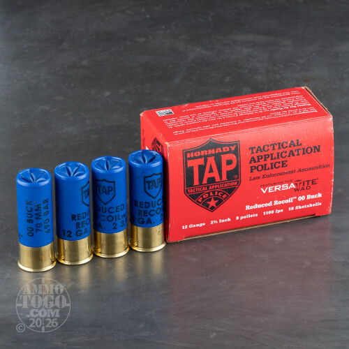 A heavy shotgun is able to soak up a massive amount of recoil, but what if you don’t feel like lugging around a telephone pole when you check the strange noise emanating from your living room? In that case you want this 12 Gauge shotshell from Hornady’s TAP Low Recoil line of ammunition. Its relatively slow muzzle velocity conveys a substantially lighter kick, which will allow you to stay on target as you empty your magazine. It’s perfect for a pump action!This law enforcement shotshell still placks plenty of punch thanks to its eight pellets of 00 buck. Its spread won’t leave you wanting, either -- out of an 18” barrel, the pellets group well under 5” at 25 yards. This shell’s sturdy hull is blue, so you won’t easily mistake it for a full recoil round, and its non-corrosive primer and clean burning propellant won’t render your shotgun a gummy mess quickly. Check out our great deal on these loads by the case as well!