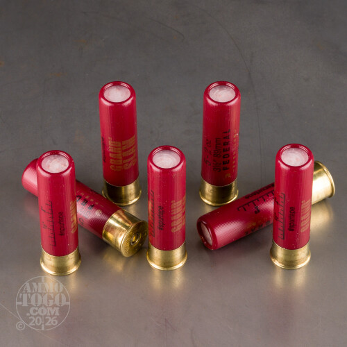 You’ve got a 12 Gauge shotgun with a 3.5” chamber. You’ve got a pretty good idea where wild turkeys are hanging out – and you would like to shoot those turkeys. All you need now is Federal Grand Slam ammunition, each shell of which dumps a generous 2 ounces of shot in whichever direction a turkey is unfortunate enough to be situated!A turkey is a rugged bird, which is why this shell is designed to sink as many of its #5 shot pellets through those feathers as possible. Copper-plated shot is exceptionally hard, and thus equipped to avoid flattening down under pressure. Federal takes even greater care to protect their shot against deformation by suspending it in advanced granulated buffering.