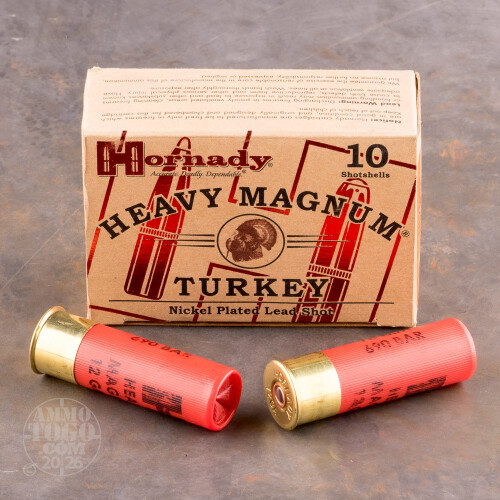This package contains 10 rounds of Hornady Heavy Magnum 12 gauge ammunition. Each 3-inch shotgun shell is loaded with 1 ½ ounces of premium #4 nickel-plated lead shot. These Hornady Turkey Loads have the thickest nickel-plating in the industry. Engineered to resist shot deformation and keep more pellets on target, these loads produce dense downrange shot patterns and powerful gobbler-dropping results.