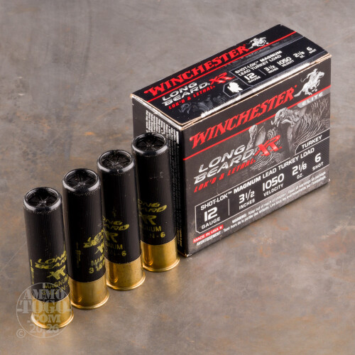 Reach out and touch a turkey at up to 60 yards with this 12 gauge Winchester Long Bear XR ammunition. These shells maintain their effectiveness at much greater distances than the competition due to their use of Shot-Lok resin buffering. Shot-Lok starts as a liquid poured into the shell, where it dries solid. When the shell is fired, the resin shatters instantly and forms a buffer that provides unmatched protection to the pellets. Each 3-1/2" shell in this box of 10 fires a heavy 2-1/8 oz. column of #6 birdshot at a muzzle velocity of 1,050 feet per second.-