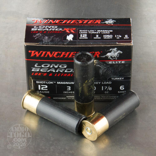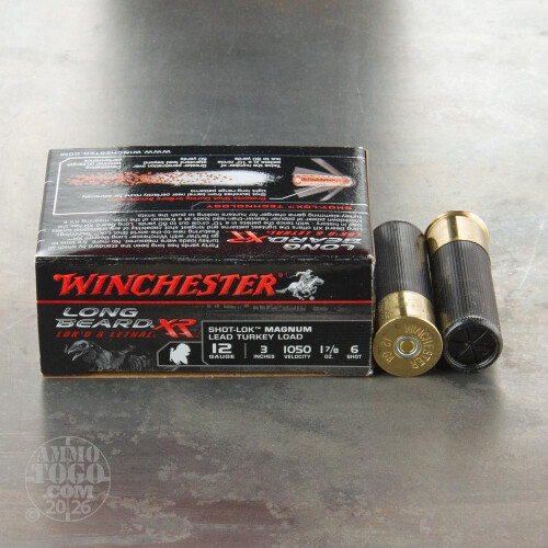 Winchester Long Beard XR shotshells deliver strong performance against turkeys even at extended ranges thanks to Shot-Lok buffering. Each 3" shell is filled with 1-7/8 oz. of #6 shot suspended in a resin substance that shatters on firing and acts as a highly protective form-fitting buffer. This results in tighter patterns with fewer "flyers" that stray off course and waste their energy. These shells are loaded in Oxford, Mississippi using high quality wads and primers.-