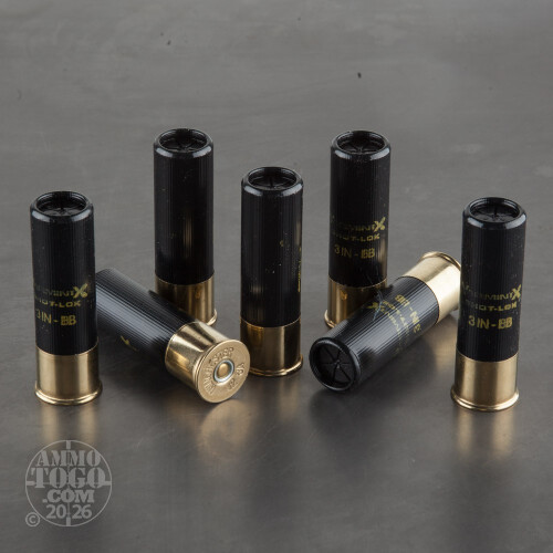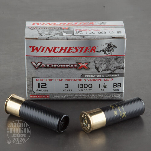 This is 12 Gauge Winchester Varmint-X ammo. This ammo comes 3 inch shells and is loaded with 1.5 ounces of BB shot. This shot has an advertised muzzle velocity of 1300 feet per second, and is perfect for hunting small varmints and predators at close or medium range, and can even be used for hunting geese. Winchester has a great reputation for producing quality ammunition that has reliable and consistent performance. This ammo come packaged in 10 round boxes.-