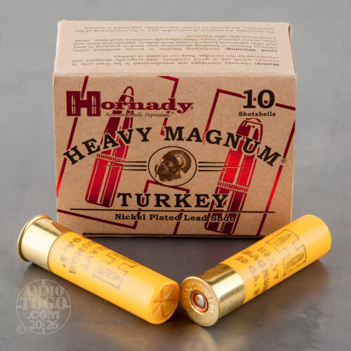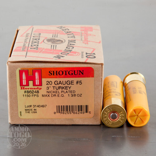 This is 20 Gauge Hornady Heavy Magnum Turkey 3" Max Dram 1 3/8oz. #5 Nickel-Plating Shot Ammo. The three-inch, 20 gauge Heavy Magnum Turkey is loaded with 1 3⁄8 ounces of #5 nickel-plated lead shot. Shot deformation is minimized, thanks to the thickest nickel-plating in the industry, which reduces fliers and keeps more pellets on target for dense patterns. The Versatite wad does the patterning, and typically patterns best with an improved cylinder or modified choke. The wad strips cleanly from the pellets in flight without disrupting them, resulting in a shorter shot string that delivers more collective energy on impact. At 1150 feet per second, the 20 gauge Heavy Magnum Turkey ammunition allows hunters to achieve lethal results out to 50 yards.
