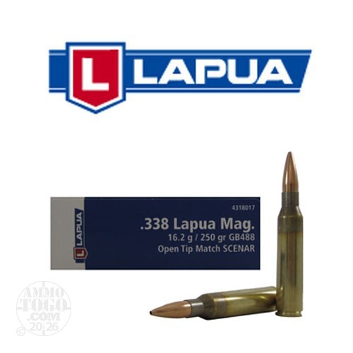 This package contains 10 rounds of .338 Lapua Magnum ammunition. Each factory fresh cartridge is topped with a 250 grain Scenar open tip match projectile. Designed for serious long-range and bench rest competition shooting, Scenar bullets were used to set the world record perfect score in the 300-meter Moscow championship.