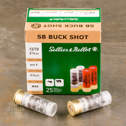 This is 12 Gauge Sellier and Bellot 2 3/4" 1 1/8oz. 9 Pellet 00 Buckshot Ammo. Sellier and Bellot produces a wide range quality ammunition, and these shells are one of those products. This 9 pellet 00 buckshot is loaded to maximum dram equivalent and is perfect for either home defense or hunting predators and varmints. It comes packed in 25rd. boxes, 10 boxes per case. Muzzle Velocity: 1300 FPS.