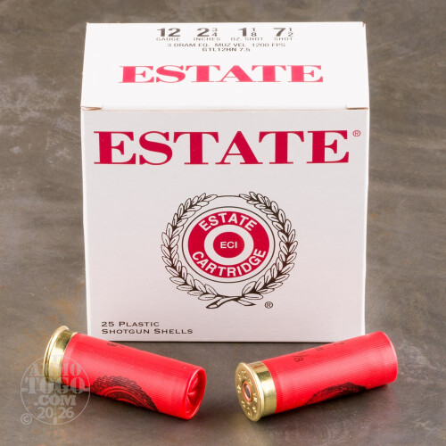 This is 12 Gauge Estate Dove and Target Load 2 3/4" 3 Dram 1 1/8oz. #7 1/2 Shot Ammo. Estate Cartridge shotshells may be used for a variety of applications both in the field or at the range. Muzzle velocity of 1200fps. This ammo is made in the USA and comes packed 25rds. per box.