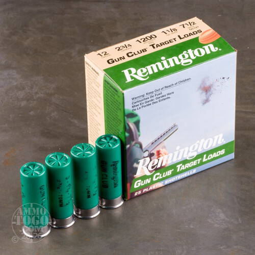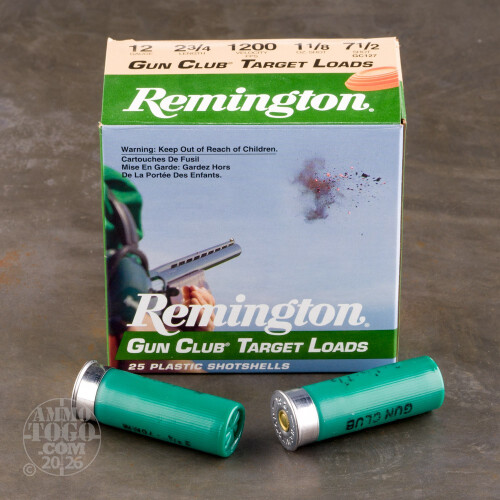 This is 12 Gauge Remington Gun Club 2 3/4" 1 1/8 oz. #7 1/2 Shot Ammo. This is an economical target load and is loaded with a Power Piston wad and STS primers. This ammo has a muzzle velocity of 1200fps. and comes packed 25rds. per box.