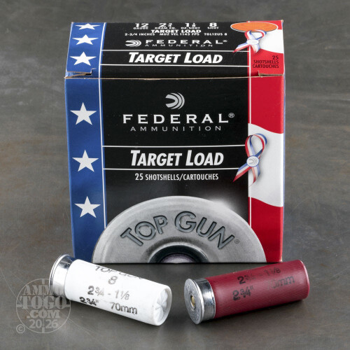 This is 12 Gauge Federal Top Gun Target Load 2 3/4" 1 1/8oz. 2 3/4 Dram #8 Shot Ammo. For the volume shooter like you who needs consistent performance at a reasonable price, there’s Federal's Top Gun target load. Long a staple of the target shooting community, you’re sure to break clay after clay with its superior performance and reliability. This is a top quality target load at an affordable price. These special edition red, white and blue hull target loads are part of an important mission. Federal ensures that a portion of the proceeds from the sale of this product will go directly to support Wounded Warriors. This ammo has a muzzle velocity of 1145 fps and comes packed 25rds. per box, and 250rds. per case.