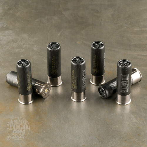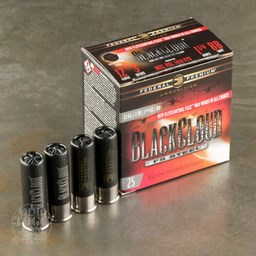 Federal's Black Cloud loads have recently received an update in component quality, granting them greater performance at long range. Each 12 gauge shell is loaded with potent powder which burns consistently, even in cold weather, and produces a muzzle velocity of 1,500 feet per second thanks the propellant capacity afforded by the shotshell's 3-inch format. The shell's metallic head is plated with black nickel for enhanced corrosion resistance in wetland environments.The 12 gauge shell hosts 1-1/4 ounces of large BB sized steel shot which do serious damage to ducks and geese; terminal results are further enhanced by Federal's Flitestopper pellets which make up 40% of the load; Flitestoppers have a raised belt with a sharp edge which increases wound size for more efficient energy transfer and humane kills on big birds. Federal packs the pellets into their Flitestopped Flex wad which can move through ported chokes without shedding and helps to keep patterns tighter for greater shot cloud density out to long ranges.