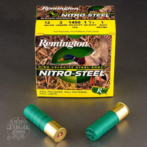 This is 12 Gauge Remington Nitro-Steel 3" 1 1/4oz. #1 Shot Ammo. The Waterfowl hunter is up when they sleep, to go out into the cold, the wind and the wet, knowing the temperature may not climb above freezing. They hunker for woodies, sprigs, and greenheads amongst the reeds and farm ponds. Remington understands how you hunt, what you hunt, and what you expect from your equipment. That's why we offer superior craftsmanship in waterfowl shotshell ammunition. Looking for premium performance without the premium price? Nitro-Steel delivers. Greater hull capacity means heavier charges and larger pellets, which makes these loads ideal for large waterfowl. Nitro-Steel delivers denser patterns for greater lethality and is zinc-plated to prevent corrosion. This ammo comes packaged 25rds to a box, 250rds to a box. Muzzle Velocity: 1450 FPS.