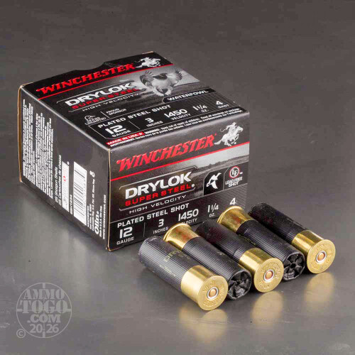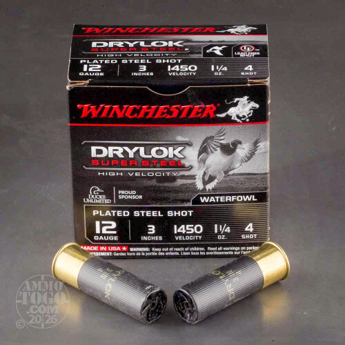 Winchester Drylok is a great option for all your waterfowl hunting needs. Equipped with a magnum shotcup, lacquered primer, plated steel shot, Drylok super steel wad, this water resistant ammo is perfect for your duck hunting expedition. This 34 steel shot is perfect for medium and small ducks and is in compliance with state and local laws that ban lead ammo. Pick up a 25 shell box of this #4 steel shot 1 1/4 ounce 3" Winchester Drylok ammo!-