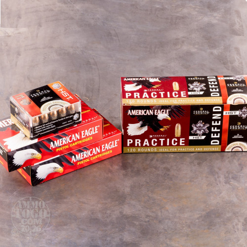 This 45 ACP Combo Pack by Federal includes two types of cartridges: FMJ and JHP. Both are loaded with 230 grain projectiles, and both deliver identical muzzle velocities and energies. That means you can practice your aim with the 100 FMJs, learn how they feel, and then be ready to defend yourself with the remaining 20 JHPs!Ths FMJs themselves are from Federal’s American Eagle label, reliable and cost-effective so you can enjoy a good return on investment from your time at the range. The JHPs are from Federal’s HST label – premium self-defense projectiles. An HST features an optimized nose profile for smooth feeding in a semi-auto, jacket and core that hold together for deep penetration of the target, and nose cavity that resists clogging so it can deliver wide terminal expansion. The HST consistently shines when tested according to the FBI’s self-defense bullet protocol!