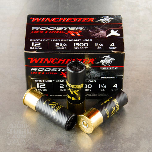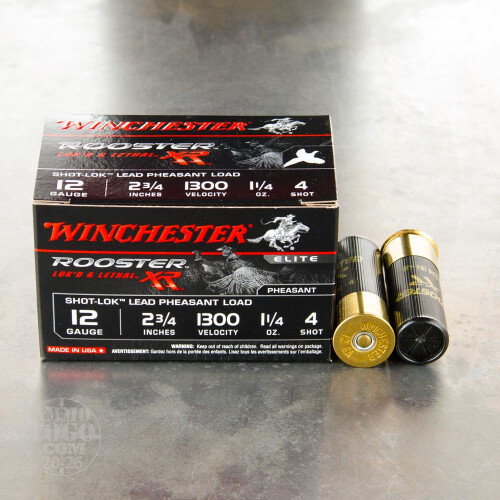 Winchester's Rooster XR line of shot shells are geared toward the serious pheasant hunters. These 2-3/4" hulls carry a 1-1/4 oz. payload of #4 lead shot that leave the barrel at 1,300 feet per second. Winchester incorporates Shot-Lok technology to help keep patterns tight and provide deeper penetration. These 2-3/4" loads are the lightest 12 gauge load in Winchester's Rooster XR line. Pick up some of these shells and see why so many hunters trust the Winchester name.-