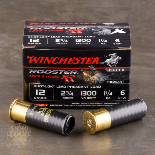 If you are heading out in the field for pheasants, this is the ammo for you. Winchester Rooster XR was specifically designed to help you bag more birds. These 2-3/4" shells are filled with 1-1/4 oz. #6 lead shot. Winchester uses Shot-Lok technology to protect the shot as it leaves the barrel. The results are deeper penetration and impressive terminal performance. Winchester has earned their reputation for providing high quality and dependable ammunition to shooters and hunters.-