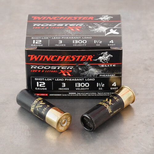 Winchester 12 gauge Rooster XR is a premium choice for upland bird hunting. These 3" hulls hold 1-1/2 oz. of #4 copper-plated lead shot and have a muzzle velocity of 1,300 feet per second. Rooster XR shells utilize Shot-Lok technology to help keep your patterns tight and provide deeper penetration. The Winchester name is a globally recolonized brand that hunters have trusted for years. Pick up a box of these Pheasant shells and bag more birds on your next day out in the field.-
