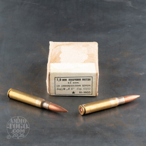 This is 8mm Mauser Yugoslavian military ammo. This ammo was manufactured in the 1950's. It is brass cased, berdan primed and mildly corrosive. It has a 198gr. FMJ bullet.