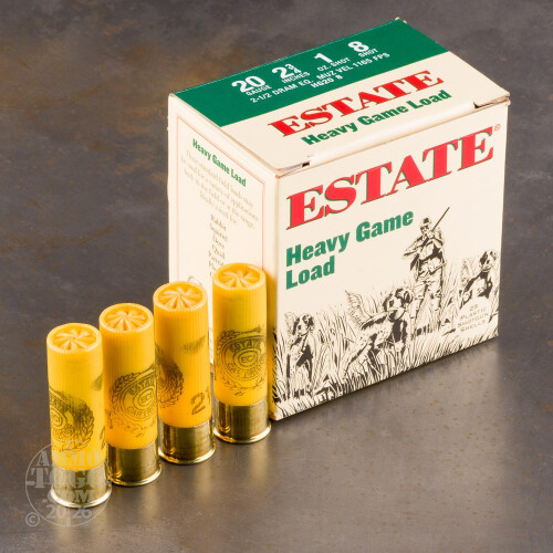 This is 20 Gauge Estate 2 3/4" 1oz. #8 Shot Heavy Game Load Ammo. These Heavy Game loads may be used for a variety of applications both in the field or at the range. This Estate round is ideally suited for Rabbit, Squirrel, Dove, Quail, Partridge, Pheasant and Chukar hunting. Muzzle velocity of 1165fps. This ammo comes packed in 25rd boxes, 250rds per case.