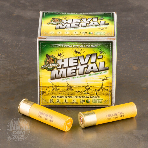 This is 20 Gauge Hevi-Shot 3" 1 oz. #4 Shot Hevi-Metal Ammo. Hevi-Shot's new Hevi-Metal Waterfowl Load uses new Pattern Density Technology to increase the number of pellets on target versus the competition. These shotshells put 20% more lethal pellets on-target at 40 yards than any steel ammunition. More lethal pellets equals more clean kills! Remember - you didn't come this far to miss! This ammo comes packed in 25rd. boxes, 10 boxes per case.