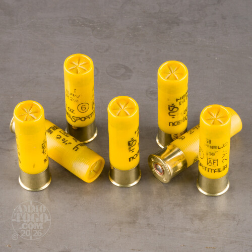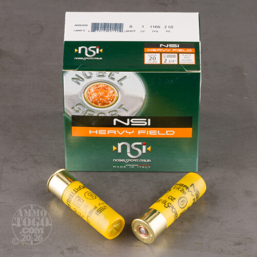 This is 20 Gauge NobelSport Hunting 2 3/4" 2 1/2 Dram 1oz. #6 Shotshells. This Shotgun Ammo is manufactured by NobelSportItalia in Italy and they are premium quality shells. There is a difference in hunting cartridges! Many manufacturers use cheaper, softer shot or lesser grade powder and components to save money. In today's world, there are just too few opportunities to make that "shot of the day" to accept anything but the highest quality hunting shotshells available. NOBELSPORTITALIA Hunting shotshells are assembled on the same machines, by the same craftsmen, to the same standards and using the same 21st century technology as NOBELSPORTITALIA's world class target shotshells, which are world renowned for there quality and are used by many competitive shooters. Only the finest plastic cases, high antimony hard shot, even patterning wads and famous NOBELSPORT 209 primers are used in NOBELSPORTITALIA Hunting shotshells. These are the best hunting shotshells that money can buy. This ammo is packed in 25rd. boxes, 250rds. per case.