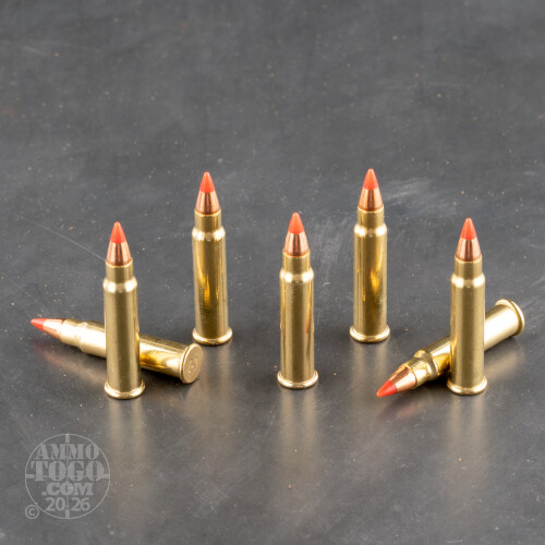 Rimfire hunters will love this bulk load of .17 HMR ammo both for their hunting needs and longterm storage plans. This ammunition comes from Hornady's "Varmint Express" line, a classic brand that's a favorite for high velocities and explosive terminal effect. Each round is assembled using a precisely shaped brass casing which is checked over for case wall strength and snag-free dimensions. The powder and priming mixture within the casing are both clean-burning and specifically picked for the best performance in this caliber. The round is topped off with a 17-grain V-MAX projectile which features a dense lead core, sleek copper jacket, and deep hollow cavity protected by a polymer tip.The red plastic tip is pointed for drag resistance and makes effective entry into small game targets like groundhogs, beavers, and jackrabbits. After entry, the tip's rearward movement will cause the bullet to expand and fragment for greater energy transfer to vital organs accompanied by faster bleeding; these are all great factors that contribute to humane, responsible, and successful hunting. As the inventors of the .17 HMR, Hornady chose the 17-grain weight for this load in order to yield impressive velocities and flat-shooting characteristics.