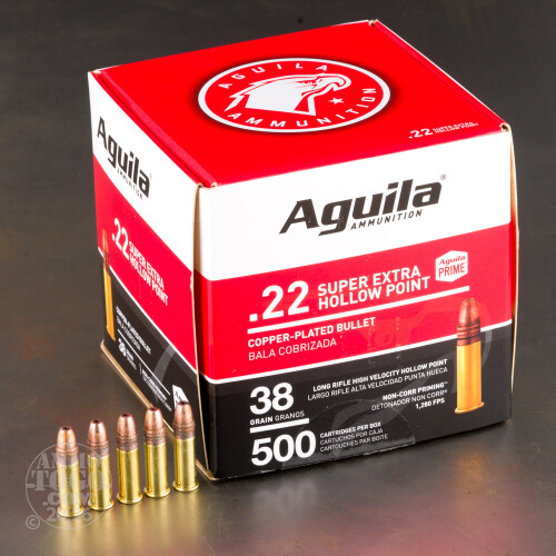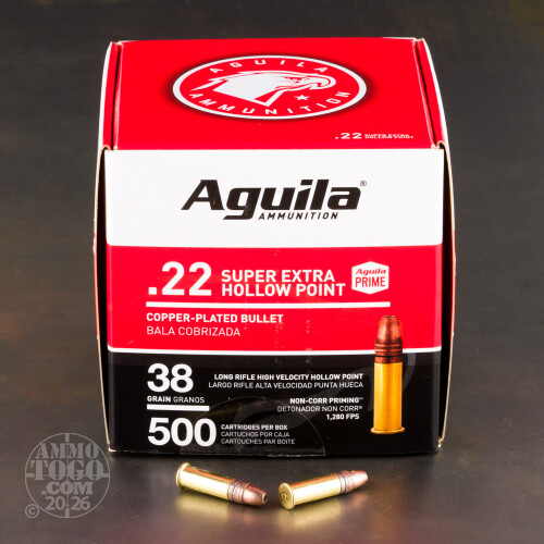 When you see that big “A” headstamp on a rimfire round, you know you picked the good stuff. This 22 LR ammunition comes Aguila of Mexico, which was founded in collaboration with Remington in the ‘60s and is now one of the world’s largest rimfire ammo manufacturers. You get four hefty 500-round boxes to a case, so you oughta be all set for at least a little while longer.A 38 grain bullet is 5% lighter than average for the 22 LR, which is part of the reason why this round’s velocity is on the higher end of the high-velocity spectrum. It’s a flat-shooting bullet that is plated with copper to help conserve a firearm’s accuracy during target practice. Or hunting, of course, because its hollow point will force the CPHP bullet to widen out if it winds up passing through a critter before hitting the dirt.