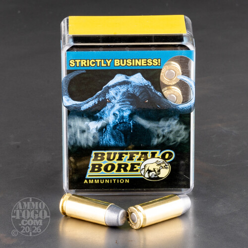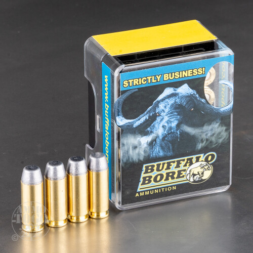 This is Heavy 10mm Buffalo Bore 220gr. Hard Cast Lead Flat Nose Ammo. Buffalo Bore 21C (a 220gr. Hard Cast plain based LFN) is the absolute heaviest bullet that can be fired through 10mm pistols. With it’s flat nose it will penetrate straight and very deeply into muscle and bone. Straight line penetration into living tissue will exceed three feet. This ammo is brass cased, boxer primed and non-corrosive. This ammo is packed in 20rd boxes.